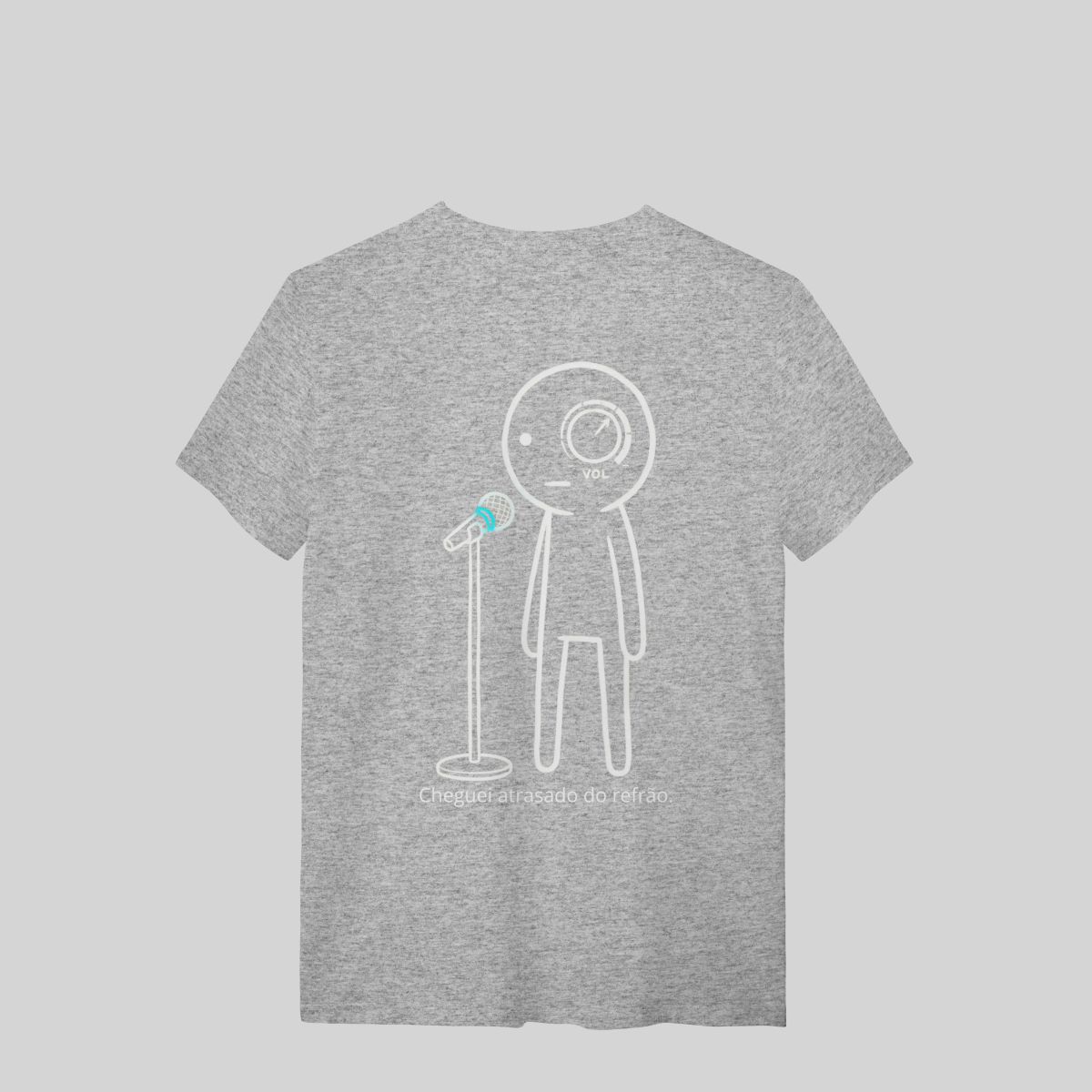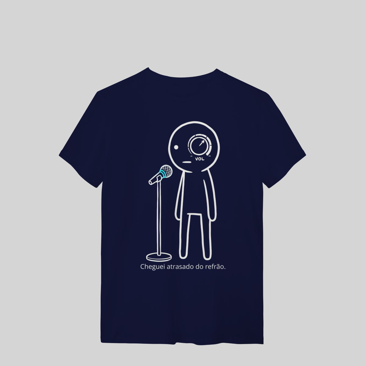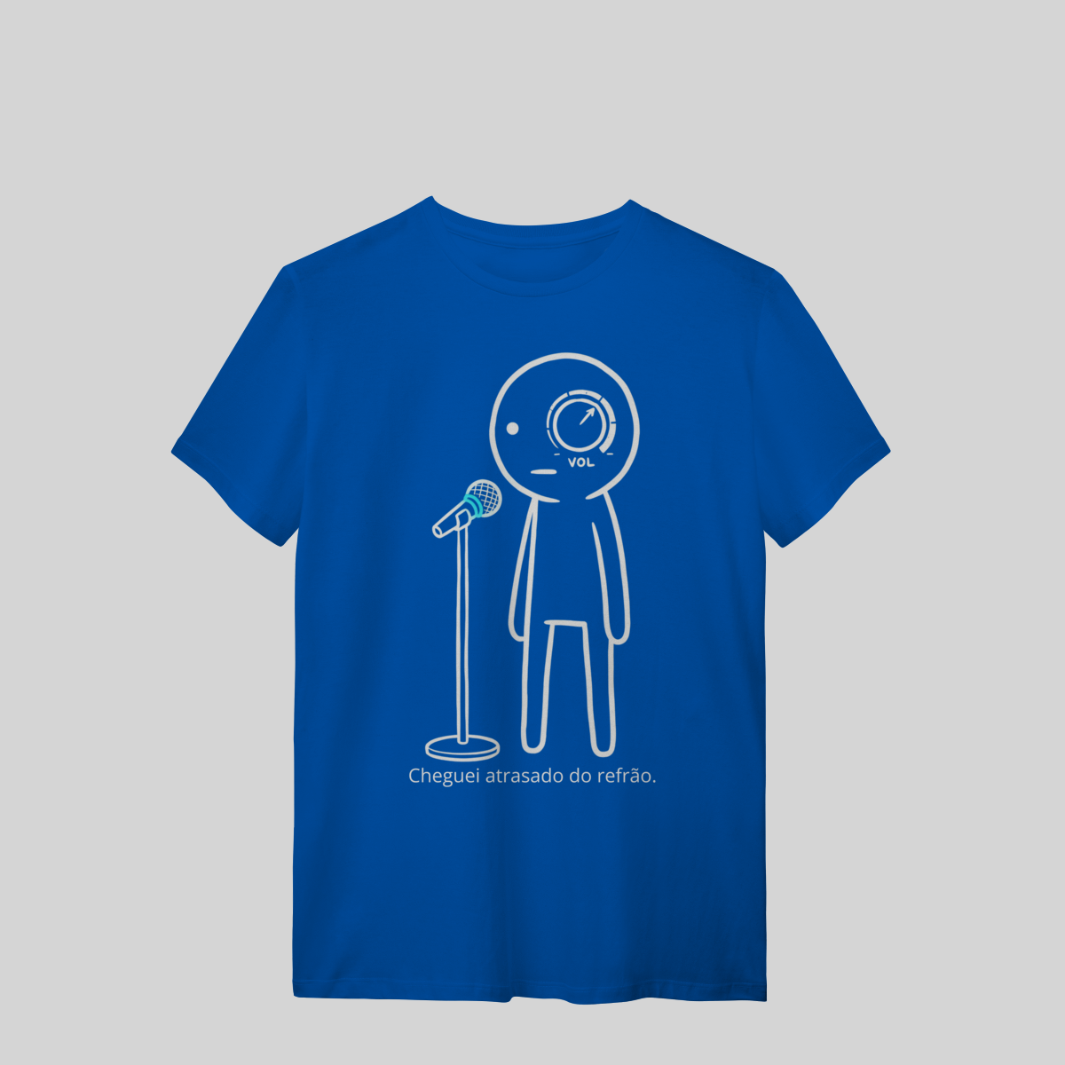 Minimalista, com o brilho azul do microfone e a frase: “Cheguei atrasado no refrão.”