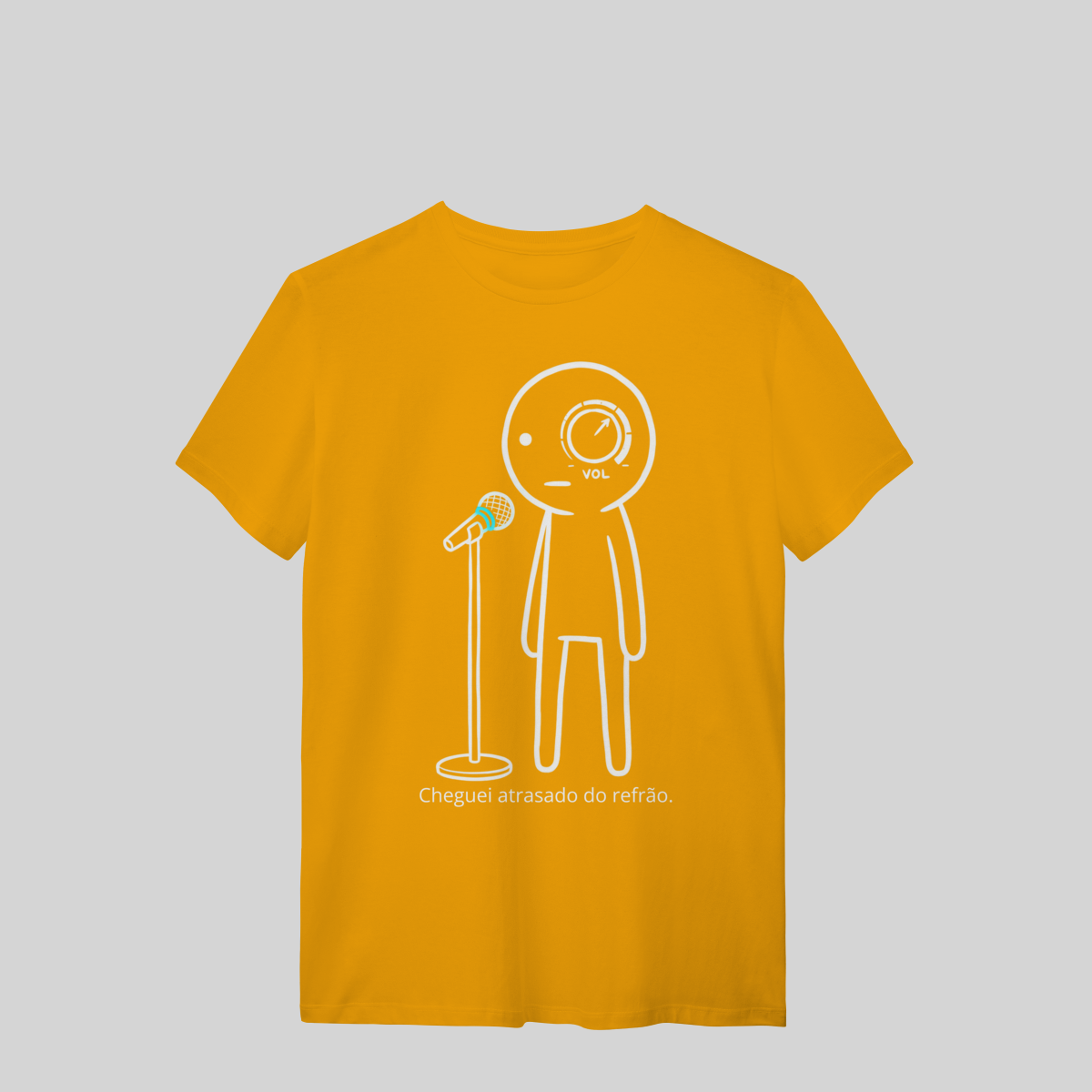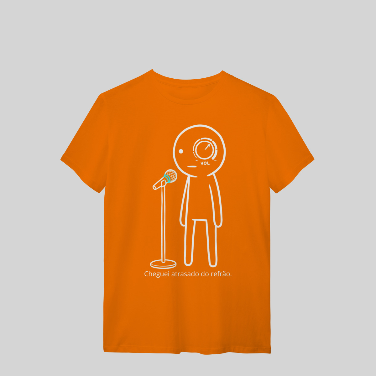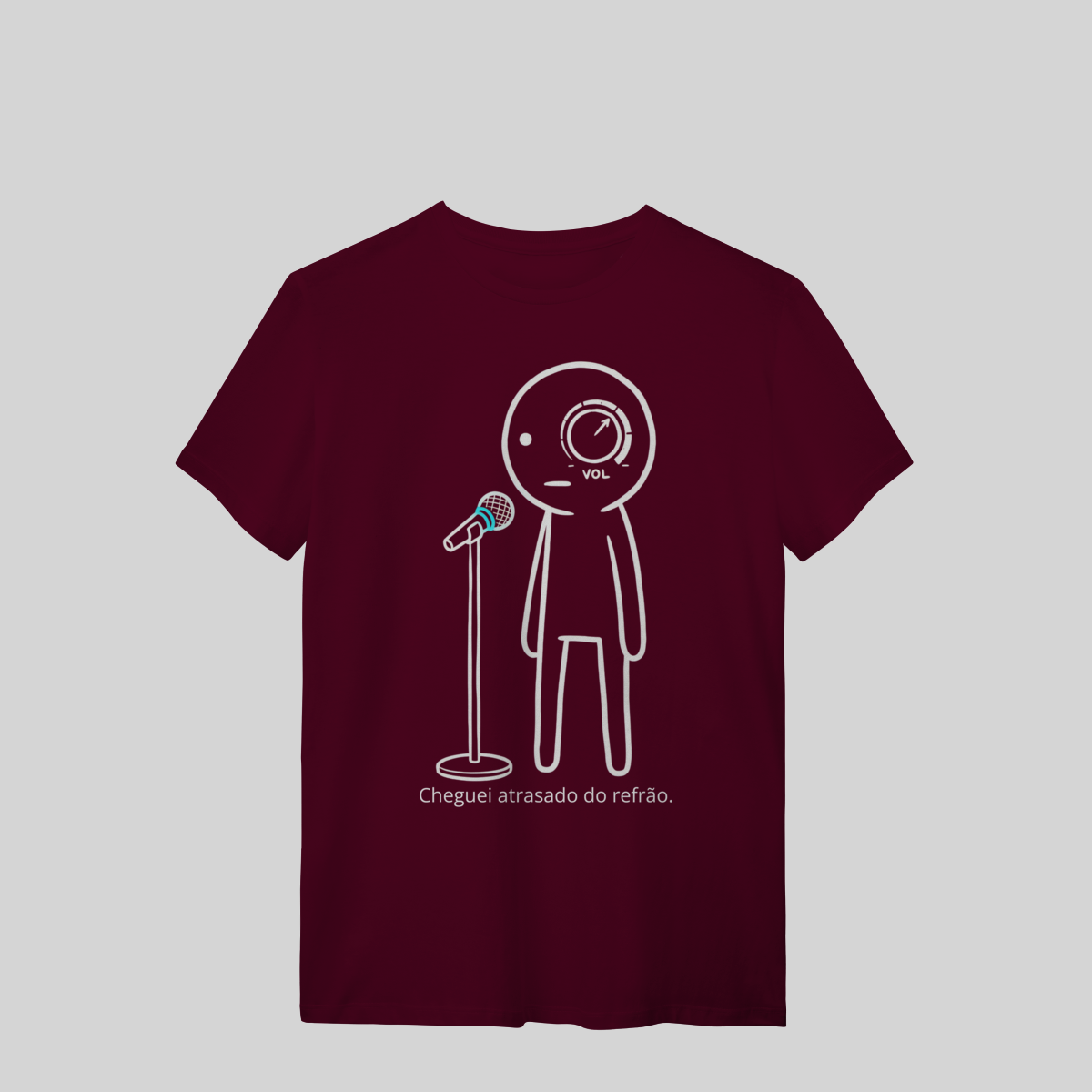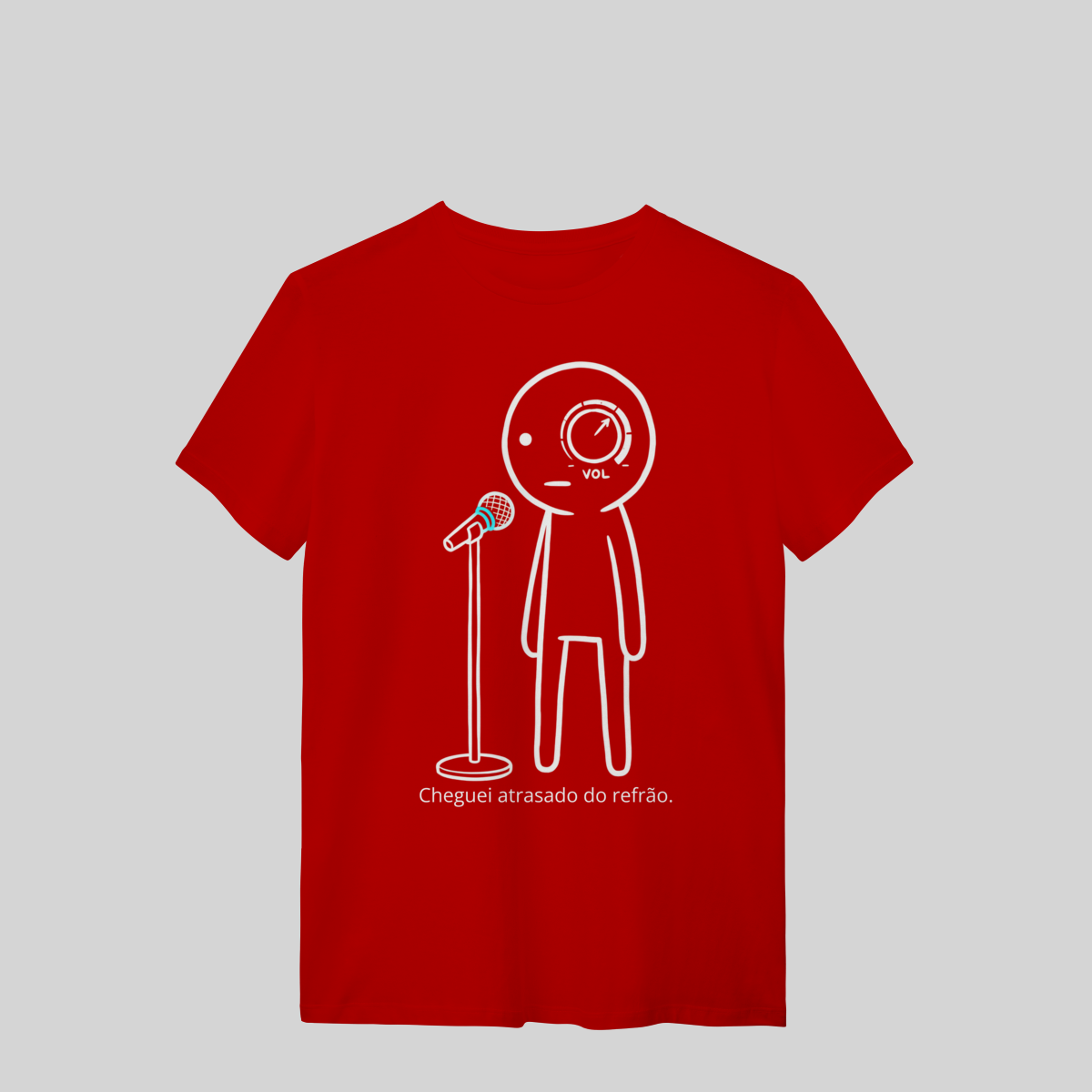 Minimalista, com o brilho azul do microfone e a frase: “Cheguei atrasado no refrão.”
